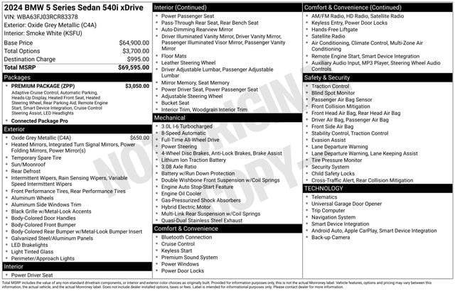 Elevate your driving experience with this exceptional 2024 BMW 5 Series 540i xDrive. Boasting a captivating Oxide Grey Metallic exterior and a luxurious Gray interior, this BMW is a true testament to German engineering and design.