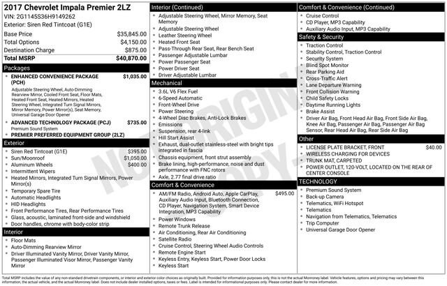 Clean CARFAX. Siren Red Tintcoat 2017 Chevrolet Impala Premier 2LZ