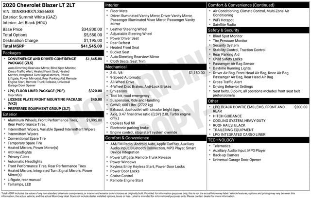 Discover the versatile and stylish 2020 Chevrolet Blazer LT, a crossover SUV that seamlessly blends modern design with impressive capabilities. This well-equipped Blazer offers a dynamic driving experience, advanced technology, and a wealth of premium features to elevate your daily commute and weekend adventures.- **ALL WHEEL DRIVE**- **CLEAN CAR FAX**- *20 GLOSS BLACK ALUMINUM WHEELS*- *3.6L V6*- *ALL WHEEL DRIVE*- *CONVENIENCE / DRIVER CONFIDENCE PKG*- *HEATED SEATS*- Remote Start- Universal Home Remote- Heavy-Duty Cooling System- Outside Heated Power-Adjustable Body-Color Mirrors- Rear Power Programmable Liftgate- 1st & 2nd Row All-Weather Floor Liners (LPO)- Inside Rear-View Auto-Dimming MirrorPowered by a robust 3.6L V6 engine, the Blazer LT delivers an exhilarating 305 horsepower and 269 lb-ft of torque, seamlessly channeled through a responsive 9-speed automatic transmission. With its available All-Wheel Drive system, you'll enjoy confident handling and traction in a variety of driving conditions, whether navigating city streets or exploring the great outdoors.The Blazer's sleek, sculpted exterior is complemented by a host of premium features, including 20-inch Gloss Black aluminum wheels, black bowtie emblems, and integrated side rails. Step inside the well-appointed cabin and you'll be greeted by premium cloth seating, dual-zone automatic climate control, and a state-of-the-art Chevrolet Infotainment 3 system with Apple CarPlay and Android Auto compatibility.For added convenience and peace of mind, the Blazer LT is equipped with the Convenience and Driver Confidence Package. This comprehensive suite of features includes Remote Start, Universal Home Remote, Heated Front Seats, Rear Park Assist, Blind Spot Monitoring, and more. Whether you're commuting to work or embarking on a family road trip, the Blazer LT is designed to keep you connected, comfortable, and safe.Versatility is at the heart of the Blazer LT, with a generous cargo area and the ability to accommodate up to five passengers. Fold down the rear seats to expand your storage capacity and tackle your next home improvement project or outdoor adventure with ease.Experience the perfect blend of style, performance, and technology in the 2020 Chevrolet Blazer LT. Visit our showroom today and let us demonstrate how this exceptional crossover SUV can elevate your driving experience.