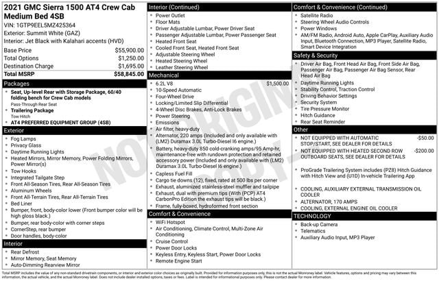 Experience the exceptional power and capability of the 2021 GMC Sierra 1500 AT4. This rugged and versatile truck is engineered to conquer any terrain, delivering an unparalleled driving experience that will exceed your expectations.- 4 x 4- 6.2L V8 EcoTec3 engine with Dynamic Fuel Management- Trailering Package- Preferred Equipment Group 4SB- Steering Wheel Audio Controls- Electric Rear-Window Defogger- 120-Volt Bed Mounted Power Outlet- Keyless Open & Start- Hill Descent Control- Spray-On Pickup Bed Liner with AT4 Logo- Heated and Ventilated Front Seats- Hitch Guidance with Hitch View- Integrated Trailer Brake ControllerThis Sierra 1500 AT4 is powered by the potent 6.2L V8 EcoTec3 engine, delivering an impressive 420 horsepower and 460 lb-ft of torque. The 10-speed automatic transmission and 4-wheel drive system ensure exceptional performance and traction, whether you're navigating challenging off-road conditions or towing heavy loads.The exterior of the Sierra 1500 AT4 exudes a bold and rugged presence, with a body-color surround grille, LED cargo area lighting, and red recovery hooks that add to its distinctive appearance. The spray-on bed liner with the AT4 logo provides durable protection for your cargo, while the deep-tinted glass and power-operated windows enhance the interior's comfort and convenience.Inside, the Sierra 1500 AT4 offers a premium driving experience. The perforated leather-appointed front seats, 10-way power adjustability, and heated and ventilated features ensure exceptional comfort and support. The Bose premium audio system, 4G LTE Wi-Fi hotspot, and intuitive infotainment system with Apple CarPlay and Android Auto integration keep you connected and entertained on the road.The Sierra 1500 AT4 also comes equipped with a comprehensive suite of advanced safety features, including the HD Rear Vision Camera, Hitch Guidance with Hitch View, and the ProGrade Trailering System, ensuring you can tow with confidence.Whether you're tackling off-road adventures, hauling heavy loads, or simply enjoying the daily commute, the 2021 GMC Sierra 1500 AT4 is the ultimate companion. Experience the uncompromising power, capability, and refinement that sets this truck apart. Visit our showroom today and let us demonstrate why the Sierra 1500 AT4 is the perfect choice for your next vehicle.