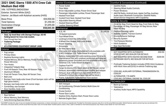 **4 X 4**, 12-Volt Rear Auxiliary Power Outlet, 120-Volt Bed Mounted Power Outlet, 120-Volt Instrument Panel Power Outlet, 2 USB Ports, 2 USB Ports (1st Row), 4.2 Diagonal Color Display Driver Info Center, 4G LTE Wi-Fi Hotspot Capable, Auto-Locking Rear Differential, Auxiliary External Transmission Oil Cooler, Body-Color Surround Grille, Color-Keyed Carpeting Floor Covering, Compass, Deep-Tinted Glass, Electric Rear-Window Defogger, Electrical Lock Control Steering Column, Floor-Mounted Center Console, Front Prem Floor Liners w/Removable Carpet Insert, GMC Connected Access Capable, HD Rear Vision Camera, Heated Driver & Front Outboard Passenger Seating, Heavy-Duty Air Filter, Hill Descent Control, Hitch Guidance, Hitch Guidance w/Hitch View, In-Vehicle Trailering App, Integrated Trailer Brake Controller, Keyless Open & Start, LED Cargo Area Lighting, Manual Tilt-Wheel & Telescoping Steering Column, OnStar & GMC Connected Services Capable, Power Door Locks, Power Front Passenger Windows w/Express Up/Down, Power Front Windows w/Driver Express Up/Down, Power Rear Windows w/Express Down, Preferred Equipment Group 4SB, ProGrade Trailering System, Rear Dual USB Charging-Only Ports, Rear Prem Floor Liners w/Removable Carpet Insert, Rear Wheelhouse Liners, Red Recovery Hooks, Remote Vehicle Starter System, Spray-On Pickup Bed Liner w/AT4 Logo, Steering Wheel Audio Controls, Theft Deterrent System (Unauthorized Entry), Trailering Package, Ventilated Driver & Front Passenger Seats.
