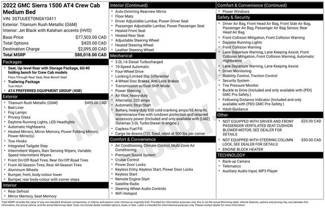 Powered by a robust 3.0L I6 engine and a smooth-shifting 10-speed automatic transmission, the Sierra 1500 AT4 delivers an exceptional blend of performance and efficiency, with an EPA-estimated 20 city/23 highway MPG. Elevate your driving experience with the premium Bose audio system, wireless charging, and a suite of advanced safety technologies that provide confidence and peace of mind on any journey.