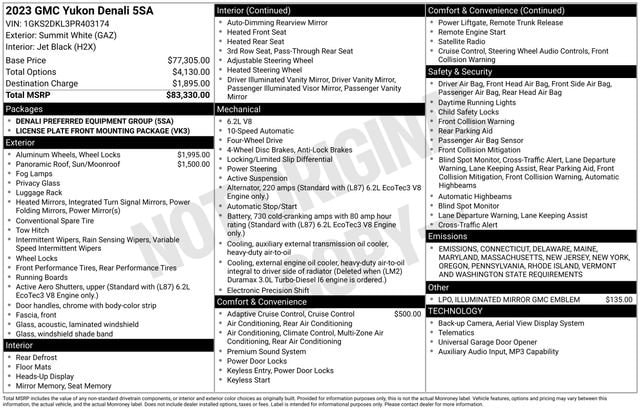 Summit White 2023 GMC Yukon Denali 4WD 10-Speed Automatic with Overdrive EcoTec3 6.2L V8* *4 X 4**, 15 Diagonal Multi-Color Head-Up Display, Adaptive suspension, Bose 14-Speaker Surround w/CenterPoint, Dual-Pane Panoramic Power Sunroof, Floor Console, HD Surround Vision, Heated & Ventilated Driver & Front Passenger Seats, Heated 2nd Row Outboard Position Seats, Heated Steering Wheel, Navigation System, Outside Heated Power-Adjustable Mirrors, Power Release 2nd Row Bucket Seats, Power Tilt & Telescopic Steering Column, Preferred Equipment Group 5SA, Rear Pedestrian Alert, Safety Alert Seat, Wheels: 22 x 9 Bright Machined Aluminum, Wireless Charging.